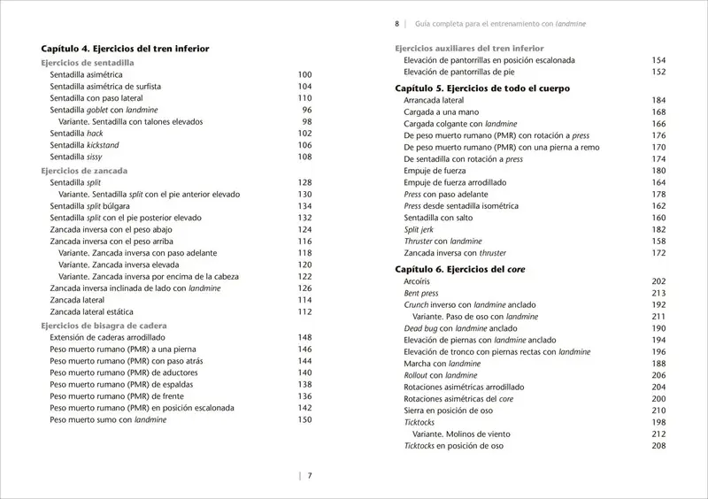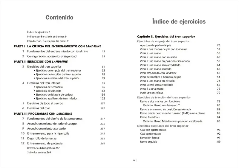 Junto con instrucciones detalladas y consejos expertos, encontrarás: 82 ejercicios para todo el cuerpo con indicaciones y modificaciones, incluidas numerosas opciones para entrenar cuando se sufren restricciones físicas; 35 sesiones de entrenamiento para el acondicionamiento de todo el cuerpo, el nivel avanzado, la hipertrofia, la fuerza y la potencia, con opciones para utilizar el landmine solo o combinado con otro tipo de equipo; y los fundamentos del diseño de los programas para ayudarte a entender principios del entrenamiento que pueden aplicarse a cualquier sesión.